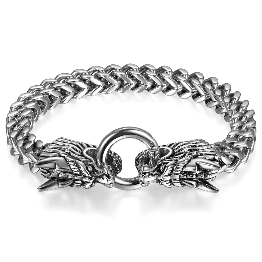 Boniskiss Viking Gothic Heavy Double Dragon Head Men's Stainless Steel Punk Chain Link - SILVER PLATED / United States