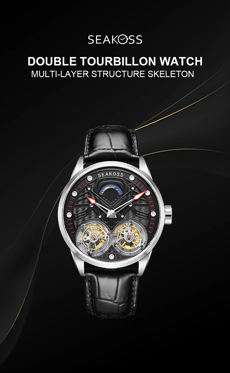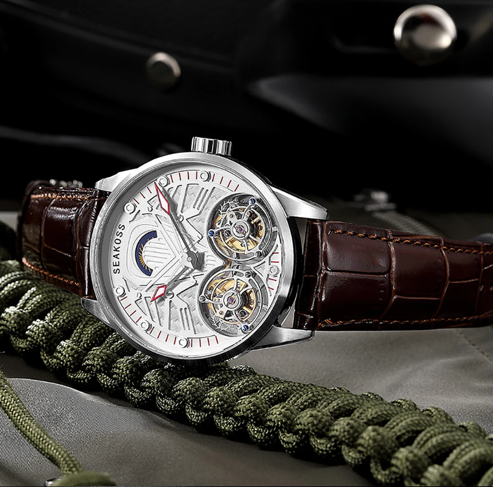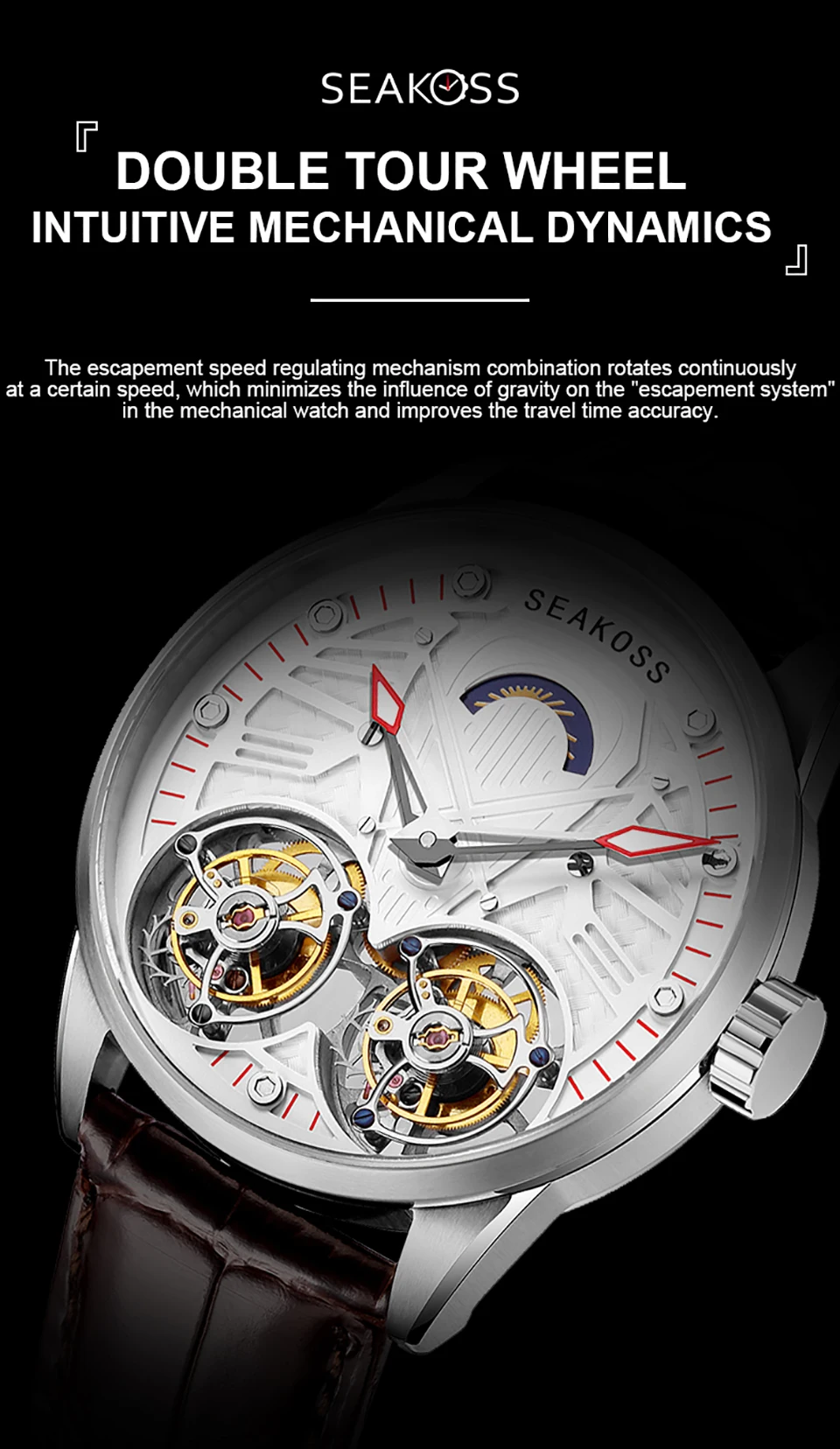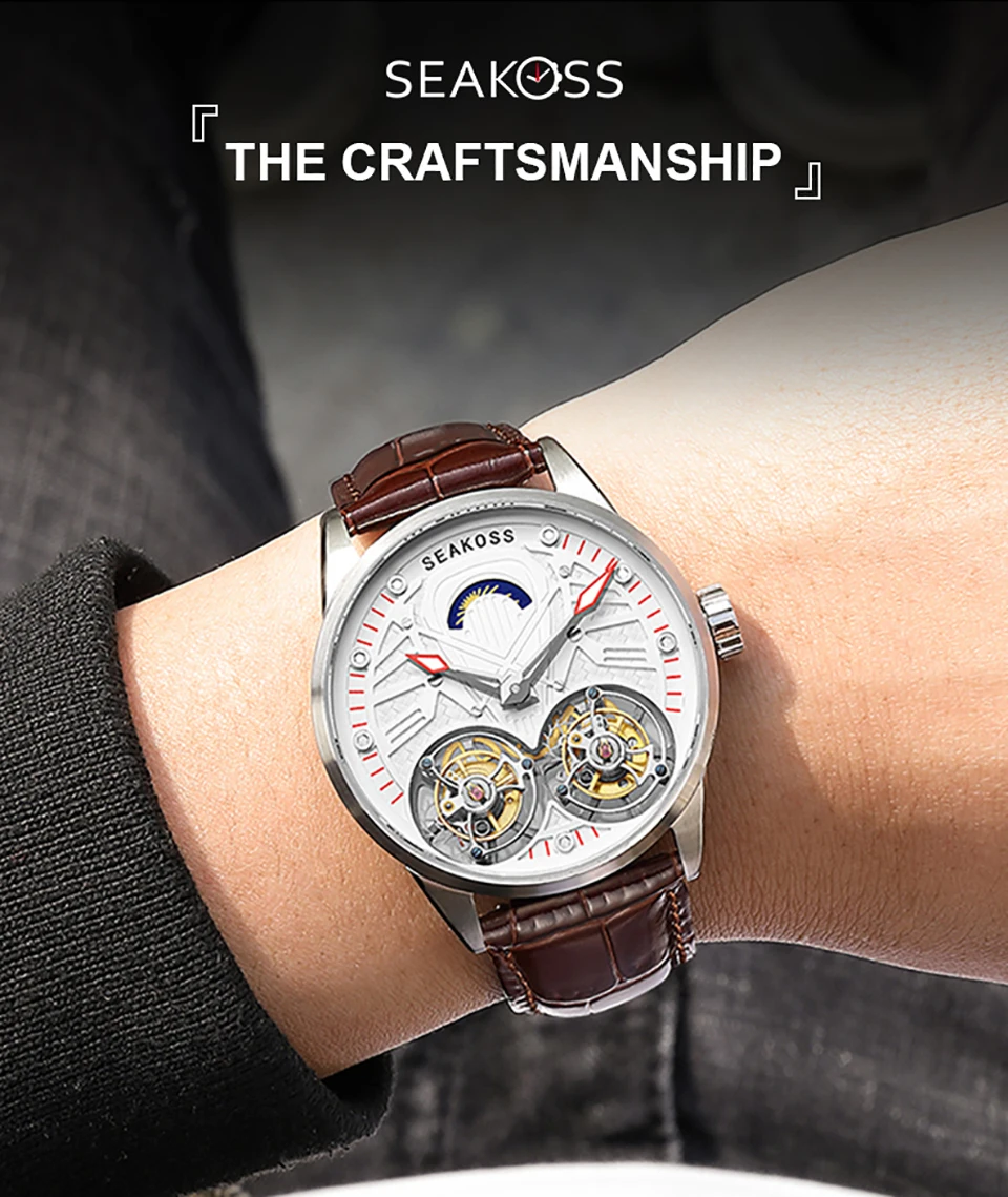 SEAKOSS Top Brand Double Tourbillon Men's Mechanical Watches- Hand Winding Movement Men`s Wristwatches with Sapphire Luminous Waterproof Lens. - White