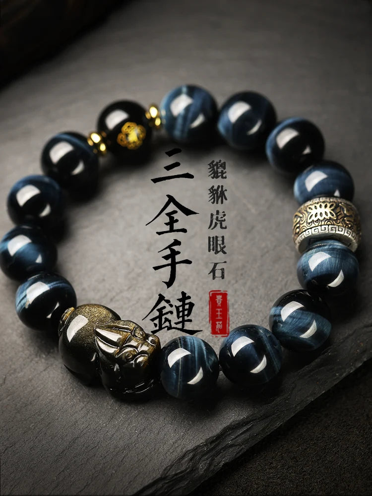 UMQ Blue Tiger Eye Bracelet- Men's High-End Gold Obsidian Brave Bracelet Collectible Lightning Pattern - Manjushri Bodhisattv