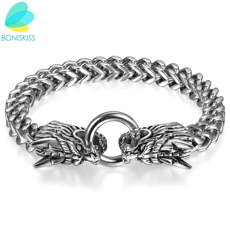 Boniskiss Viking Gothic Heavy Double Dragon Head Men's Stainless Steel Punk Chain Link - SILVER PLATED / United States
