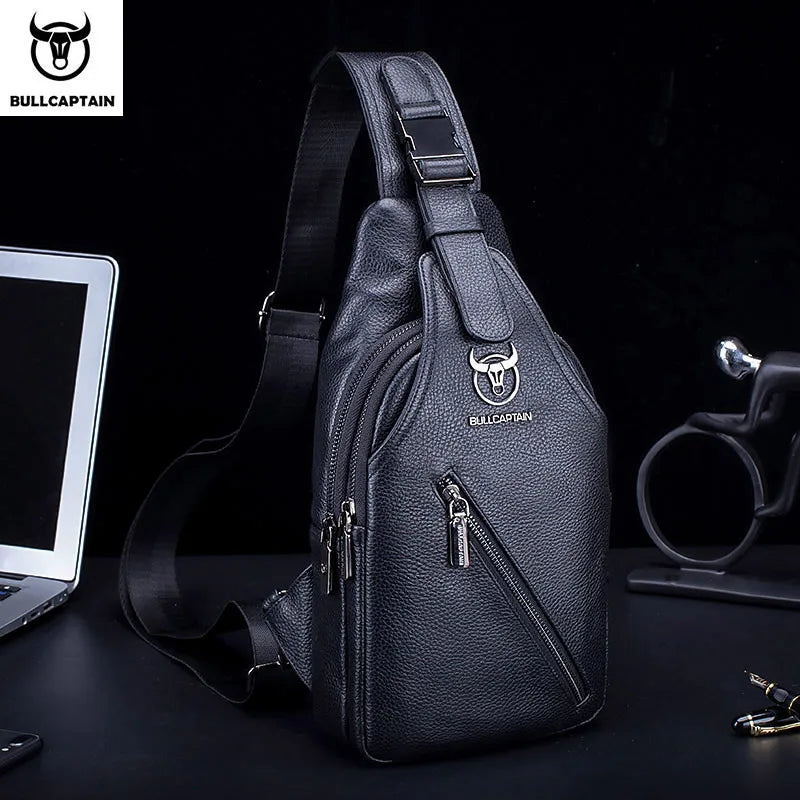 BULLCAPTAIN Men's Leather Chest Bag Multi-Function Travel Storage Bag- Men's Messenger Bag Hardware Zipper Leather Bag - xb131 black