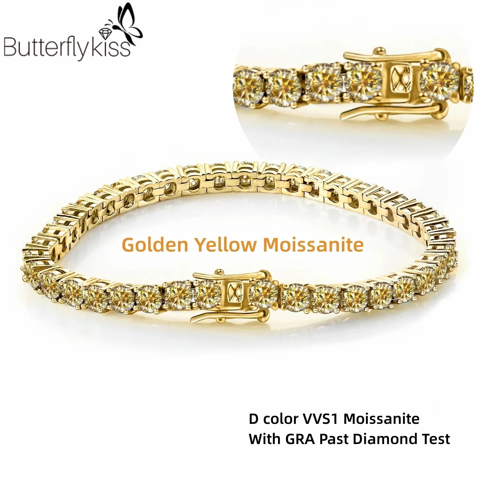 Butterflykiss Luxury GRA Golden Yellow 5/6.5mm Moissanite Tennis Bracelet For Men- S925 Sterling Silver Plated Rose Gold - Golden Yellow 6.5MM / 17cm / White Gold