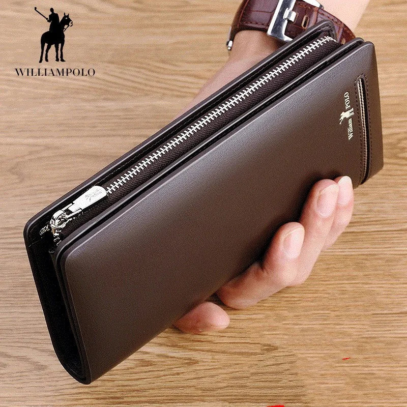 WILLIAMPOLO Men`s Wallet Long Style- High Quality Card Holder Male Purse Zipper Large Capacity Brand Cowhide Leather Wallet - Brown
