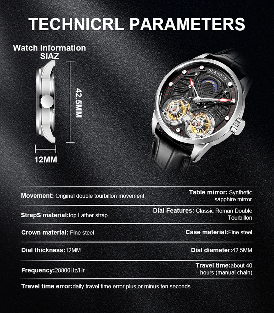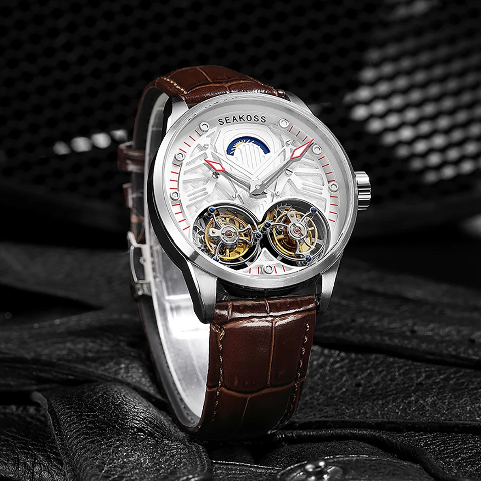 SEAKOSS Top Brand Double Tourbillon Men's Mechanical Watches- Hand Winding Movement Men`s Wristwatches with Sapphire Luminous Waterproof Lens. - White